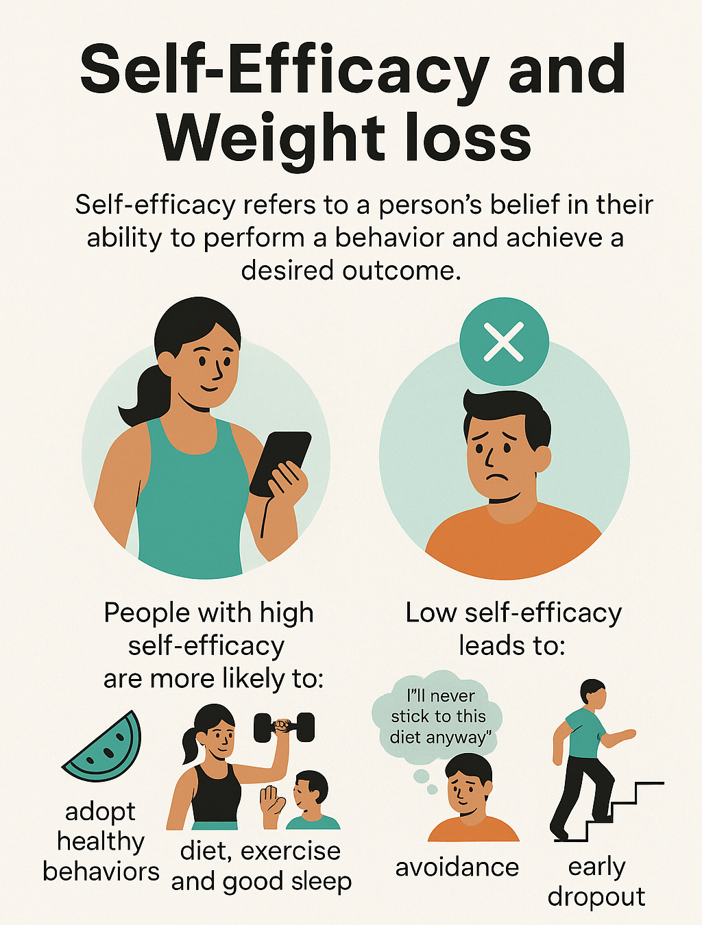 People with high self-efficacy are more likely to adopt healthy behaviors associated with weight loss — diet, exercise, and good sleep — because they believe their efforts will pay off. They feel more confident that they can resist overeating at a party or when upset.